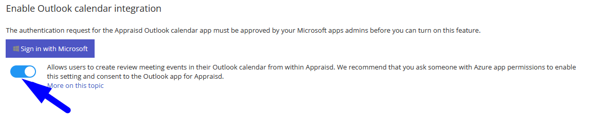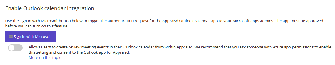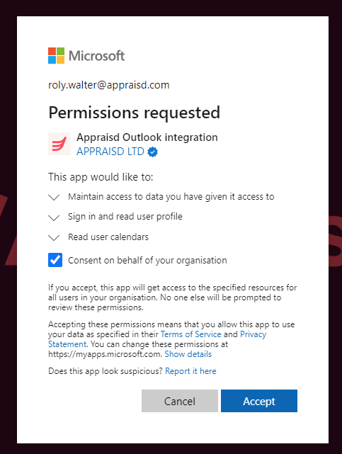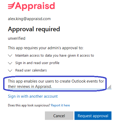 Note: I suggest asking a colleague to try the Outlook sync (both accessing their calendar in Appraisd and creating a meeting) to ensure permissions have been granted account wide by you/your IT admin.