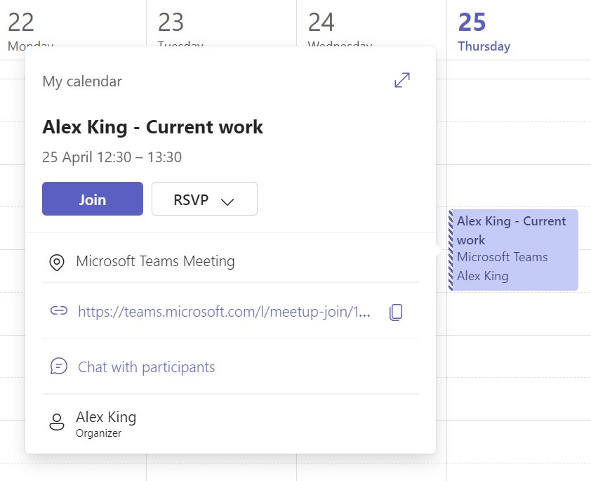 - A meeting will now appear in your Outlook or Teams calendar and also in your team-member / manager's calendar. The meeting in your calendar will also include a link back to the relevant Appraisd review or check-in so you can get back to it easily. It will look similar to this:
