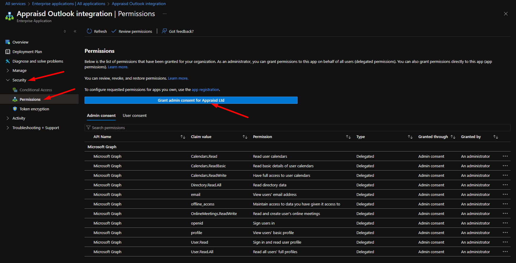 Your admin should ensure that they accept all permissions for the Appraisd Outlook enterprise app so that it looks like the below in Microsoft Entra's Enterprise Applications: